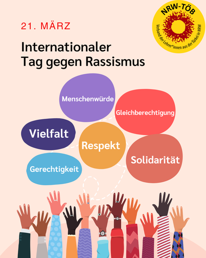 Am 21. März, dem Internationalen Tag gegen Rassismus, möchten wir erneut unsere entschiedene Haltung gegen jegliche Form von Rassismus und Diskriminierung betonen. Es ist unsere gemeinsame Verantwortung, für Gleichheit, Gerechtigkeit und eine Kultur des Zusammenlebens einzutreten und gegen jede Art von Diskriminierung zu kämpfen. Als NRW TÖB werden wir unsere Arbeit mit Entschlossenheit fortsetzen, um Toleranz, Respekt und Solidarität im Bildungswesen und in allen Bereichen der Gesellschaft zu stärken.